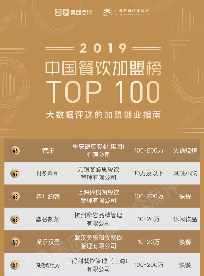 美團點評聯合中國連鎖經營協會正式發布“2019中國餐飲加盟榜TOP100”!