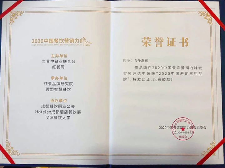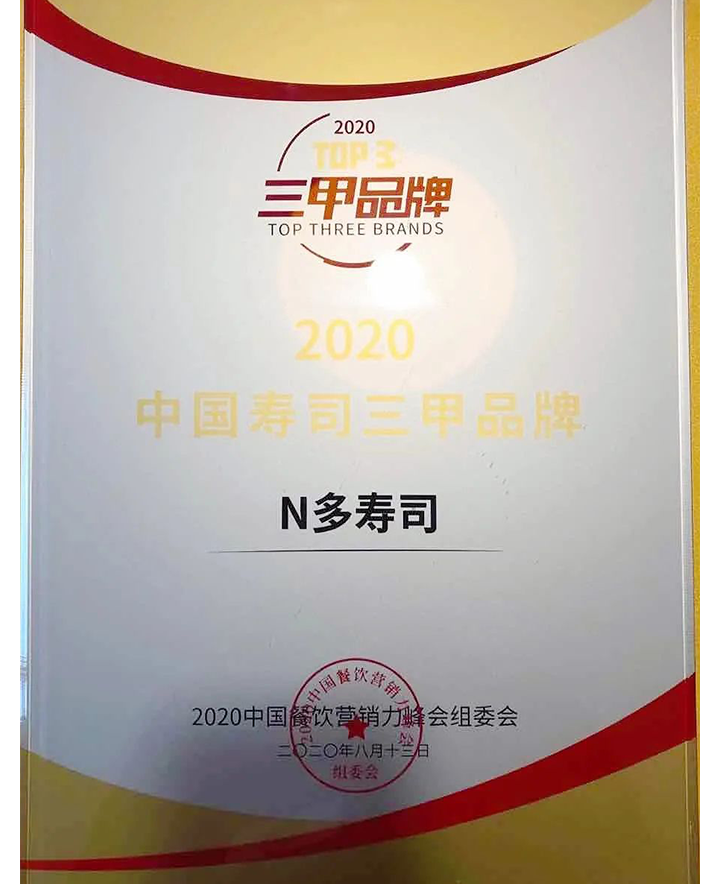 N多壽司不忘初心,獲得“2020年中國壽司三甲品牌